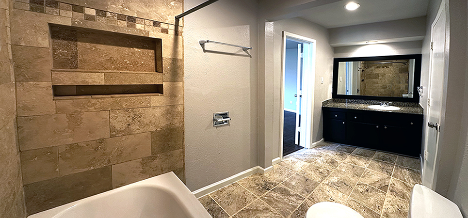 Master Bathroom - The tub surround is beautiful Travertine stone and features a large niche for keeping shower essentials tidy