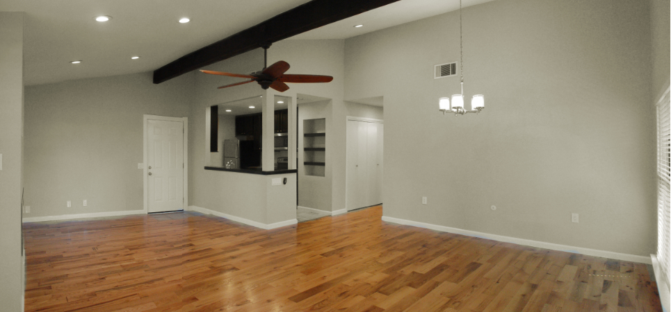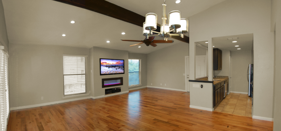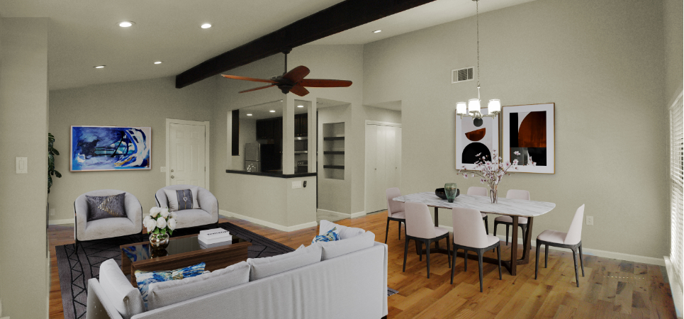 Living Room - This view shows the open kitchen & dining area, plus the beautiful fan and chandelier