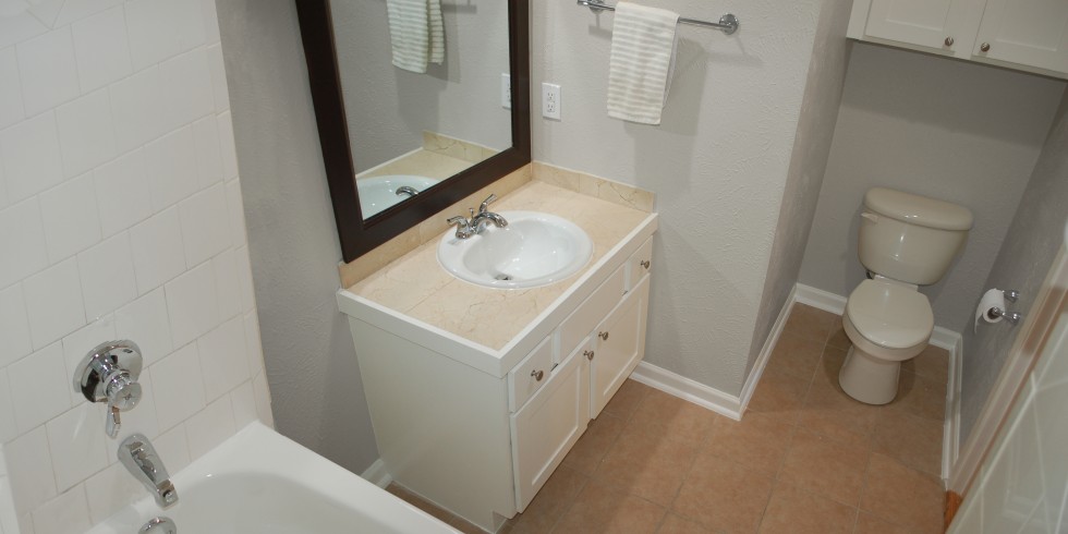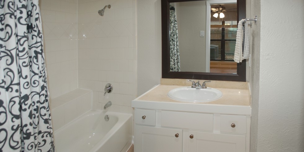First Floor Bathroom - Tub area includes a large shelf making the tub and shower feel extra spacious!