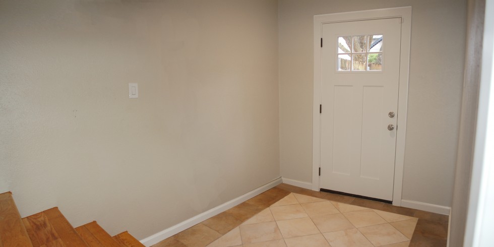 Foyer - The front door gives a glimpse of the trees and patio beyond and adds nice light to the space