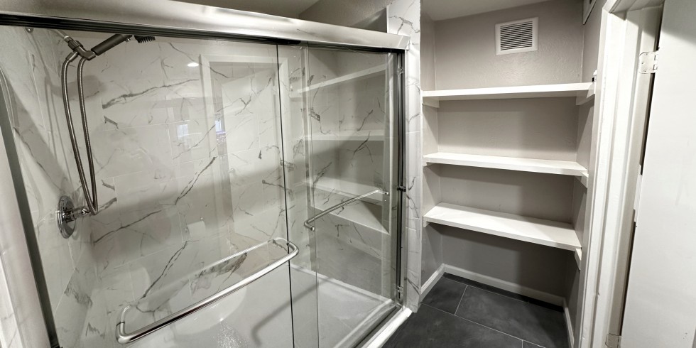 Master Bathroom - Large walk-in shower and shelving for towels and other toiletries